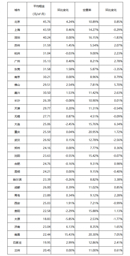 表:全國30個城市平均租金和空置率一覽表