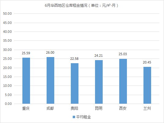 倉庫平均租金最低的城市為太原、石家莊、蘭州,均低于21元/㎡·月。相較5月,蘭州、石家莊倉庫租金波動不大;太原因受618年中大促影響,租戶集中在5月租倉,6月倉庫需求逐漸呈回落態勢,導致倉庫平均租金有所下降,降幅為5.85%。