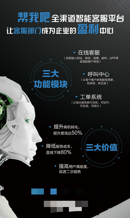 幫我吧是北京金萬(wàn)維科技有限公司在移動(dòng)互聯(lián)網(wǎng)、云計(jì)算、人工智能等新興技術(shù)正在深度革新各行各業(yè)的背景下,為企業(yè)用戶(hù)打造的新一代全渠道智能客服平臺(tái)。幫我吧擁有機(jī)器人客服、全渠道在線(xiàn)聊天、呼叫中心、工單、移動(dòng)客服、遠(yuǎn)程協(xié)助、數(shù)據(jù)統(tǒng)計(jì)等功能,用一個(gè)平臺(tái)連接電話(huà)、手機(jī)APP、微信、微博、郵箱、web等所有企業(yè)級(jí)入口。旨在幫助企業(yè)快速連接客戶(hù),顯著提高工作效率,降低服務(wù)成本,抓住每一個(gè)銷(xiāo)售線(xiàn)索,提高客戶(hù)滿(mǎn)意度和忠誠(chéng)度,讓客戶(hù)服務(wù)真正成為企業(yè)利潤(rùn)增長(zhǎng)的強(qiáng)大引擎。