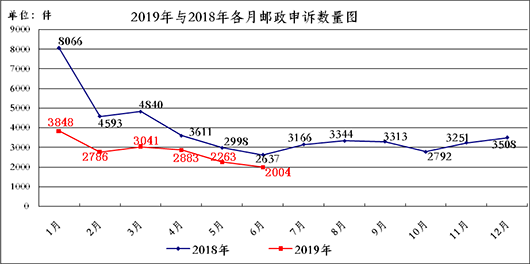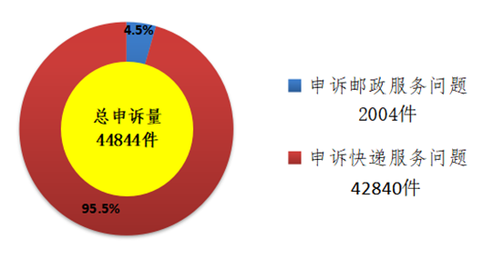 2019年6月,國家郵政局和各?。▍^(qū)、市)郵政管理局通過“12305”郵政行業(yè)消費者申訴電話和申訴網站共處理消費者申訴44844件。申訴中涉及郵政服務問題的2004件,占總申訴量的4.5%;涉及快遞服務問題的42840件,占總申訴量的95.5%。