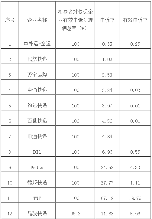 快遞服務問題有效申訴量情況統(tǒng)計表