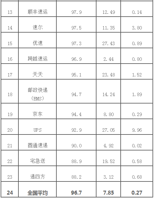 郵政業(yè)消費者對各省(區(qū)、市)郵政管理部門有效申訴處理工作滿意率平均為98.2%,高于全國平均數的地區(qū)有22個,低于全國平均數的地區(qū)有9個;各?。▍^(qū)、市)快遞服務申訴率平均為3.99,低于全國平均數的地區(qū)有16個,高于全國平均申訴率的地區(qū)有15個;各?。▍^(qū)、市)快遞服務有效申訴率平均為0.14,低于全國平均數的地區(qū)有17個,高于全國平均數的地區(qū)有14個。