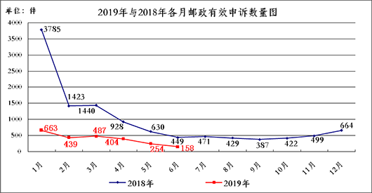 6月,企業(yè)對郵政管理部門轉辦的申訴未能按規(guī)定時限回復的有13件,與去年同期相比減少11件。