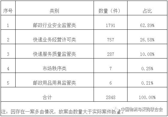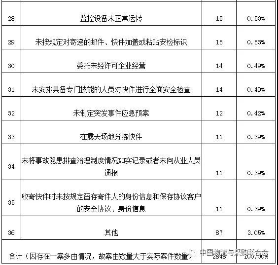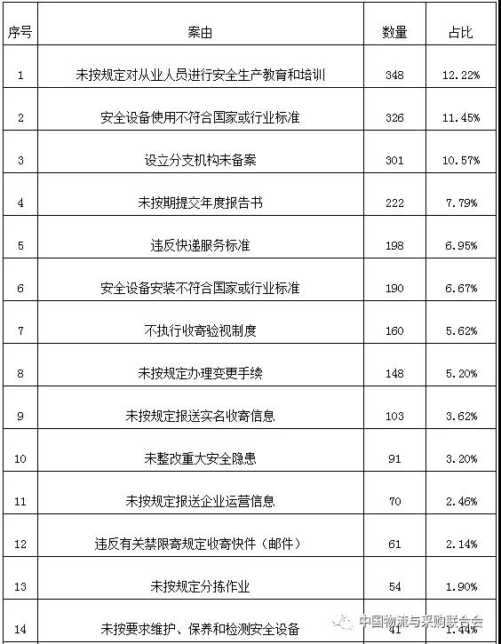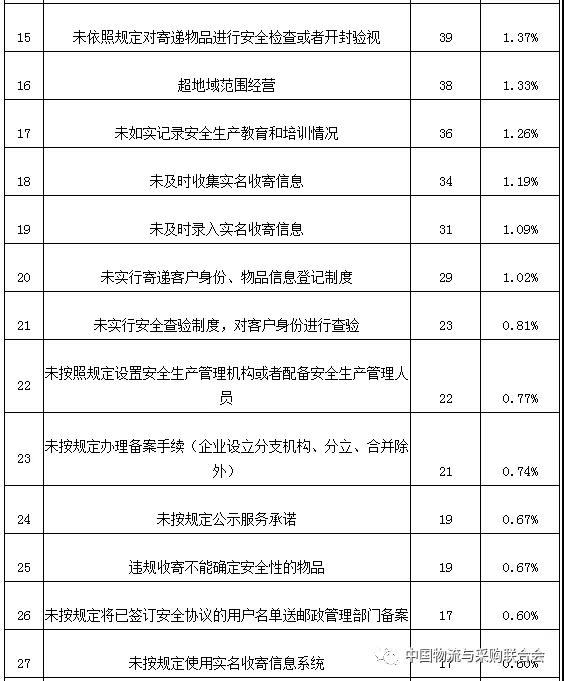 郵政行業安全監管方面的違法案件1791件,占違法案件總量的62.89%。其中,未按規定對從業人員進行安全生產教育和培訓348件,占比12.22%;安全設備使用不符合國家或行業標準326件,占比11.45%;安全設備安裝不符合國家或行業標準190件,占比6.67%;不執行收寄驗視制度160件,占比5.62%;未按規定報送實名收寄信息103件,占比3.62%;未整改重大安全隱患91件,占比3.20%;未按規定報送企業運營信息70件,占比2.46%;違反有關禁限寄規定收寄快件(郵件)61件,占比2.14%;未按要求維護、保養和檢測安全設備41件,占比1.44%;未依照規定對寄遞物品進行安全檢查或者開封驗視39件,占比1.37%;未及時收集實名收寄信息34件,占比1.19%;未及時錄入實名收寄信息31件,占比1.09%;未實行寄遞客戶身份、物品信息登記制度29件,占比1.02%;未實行安全查驗制度,對客戶身份進行查驗23件,占比0.81%;未按照規定設置安全生產管理機構或者配備安全生產管理人員22件,占比0.77%;違規收寄不能確定安全性的物品19件,占比0.67%;其他案件168件,占比5.90%。