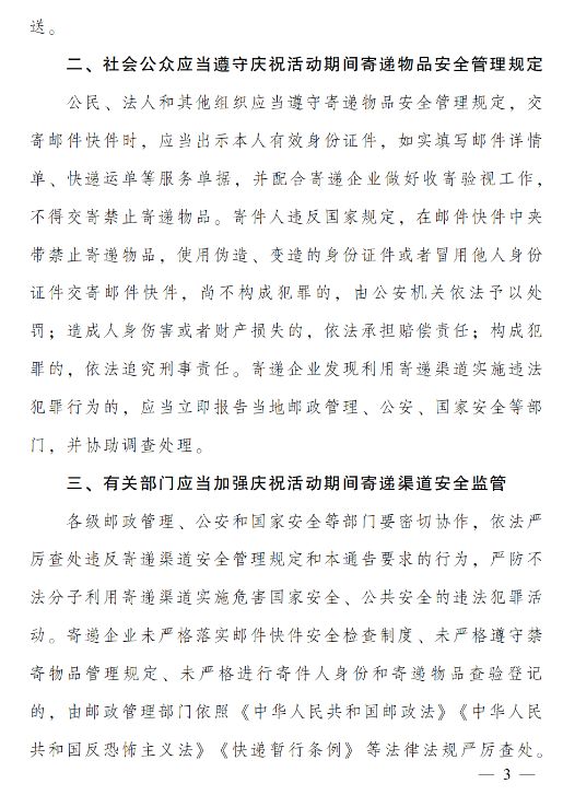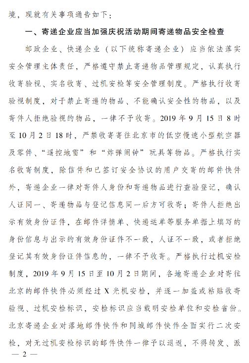 國慶70周年慶祝活動期間寄遞物品安全管理的通告