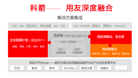 在短短的半年時(shí)間,科箭與用友不僅在產(chǎn)品融合上落地,更以融合一體化方式共同服務(wù)企業(yè)客戶。如今年共同為云南建投打造物流中臺,即在用友營銷中臺的基礎(chǔ)上,為企業(yè)提供科箭-用友云融合產(chǎn)品的物流中臺,包括TMS/WMS/OMS云,幫助企業(yè)實(shí)現(xiàn)一體化、中臺化的管理。