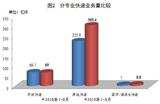 1-8月份,全國(guó)快遞服務(wù)企業(yè)業(yè)務(wù)量累計(jì)完成383.1億件,同比增長(zhǎng)26.6%;業(yè)務(wù)收入累計(jì)完成4621.8億元,同比增長(zhǎng)24.4%。其中,同城業(yè)務(wù)量累計(jì)完成69億件,同比下降1.1%;異地業(yè)務(wù)量累計(jì)完成305.4億件,同比增長(zhǎng)35.2%;國(guó)際/港澳臺(tái)業(yè)務(wù)量累計(jì)完成8.8億件,同比增長(zhǎng)25.5%。