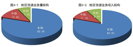 1-8月份,東、中、西部地區(qū)快遞業(yè)務(wù)量比重分別為80%、12.6%和7.4%,業(yè)務(wù)收入比重分別為80.5%、11.1%和8.4%。與去年同期相比,東部地區(qū)快遞業(yè)務(wù)量比重下降0.1個(gè)百分點(diǎn), 快遞業(yè)務(wù)收入上升0.3個(gè)百分點(diǎn);中部地區(qū)快遞業(yè)務(wù)量比重上升0.5個(gè)百分點(diǎn), 快遞業(yè)務(wù)收入比重基本持平;西部地區(qū)快遞業(yè)務(wù)量比重下降0.4個(gè)百分點(diǎn),快遞業(yè)務(wù)收入比重下降0.3個(gè)百分點(diǎn)。