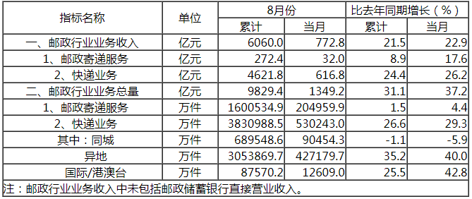 1-8月份,郵政行業(yè)業(yè)務(wù)收入(不包括郵政儲(chǔ)蓄銀行直接營(yíng)業(yè)收入)累計(jì)完成6060億元,同比增長(zhǎng)21.5%;業(yè)務(wù)總量累計(jì)完成9829.4億元,同比增長(zhǎng)31.1%。