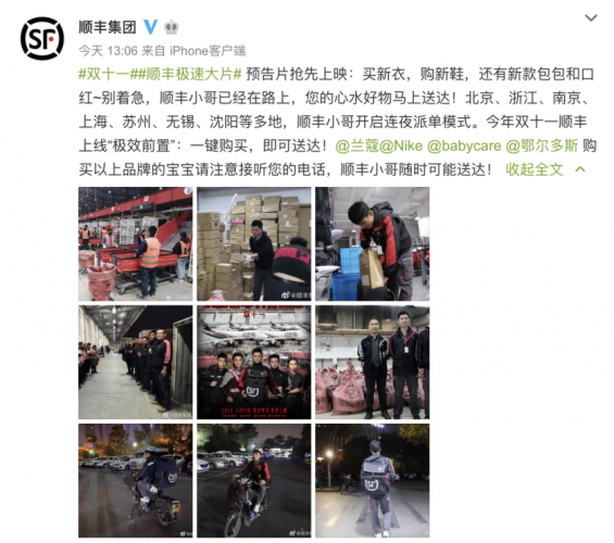 雙十一剛過43分鐘,很多人還忙著搶單,浙江一個小伙就已經收到了順豐小哥送來的NIKE鞋。這樣“閃電級”的配送速度究竟是如何實現的?據悉,這源于順豐今年全面上線的“極效前置”產品。