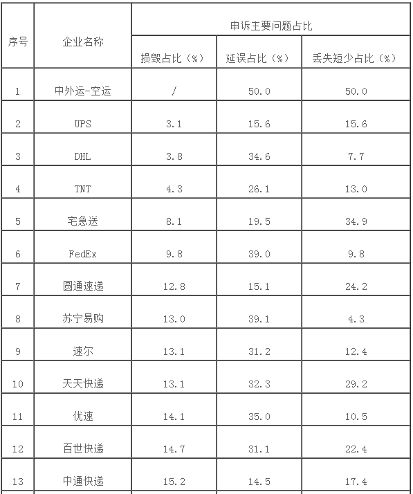 郵政業消費者對快遞服務申訴的主要問題是快件損毀、快件延誤和快件丟失短少。