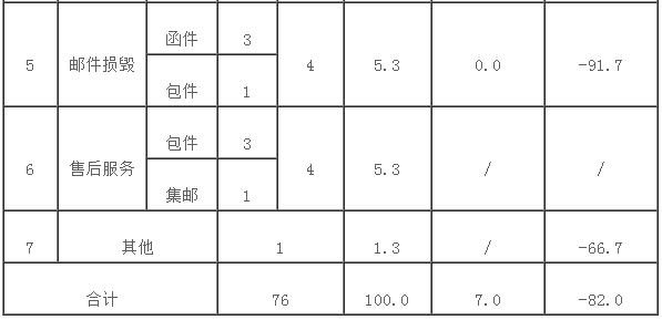 10月,企業對郵政管理部門轉辦的申訴未能按規定時限回復的有7件,與去年同期相比減少1件。