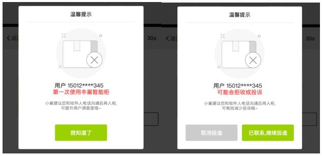 對于第一次投遞豐巢智能柜的包裹,或者收件人曾投訴過不愿意放快遞柜的包裹,都會提示快遞員需先電話溝通。