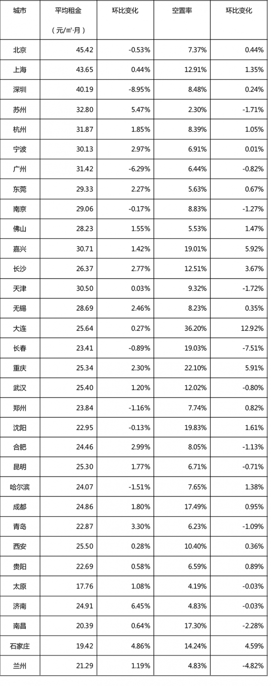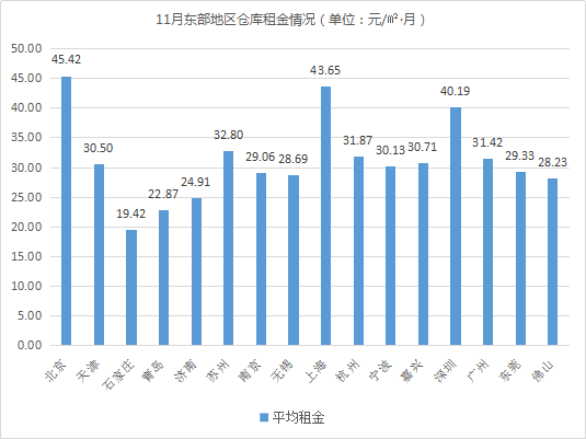 上海、北京、深圳倉庫平均租金仍然領先全國,均高于40元/㎡·月。相較10月,北京、上海通用倉儲市場穩定,平均租金波動不大;深圳因前期租金持續上漲,部分非剛需客戶逐漸轉移至東莞地區租倉,導致深圳租倉需求減少,倉庫租金有所回落,降幅為8.95%。