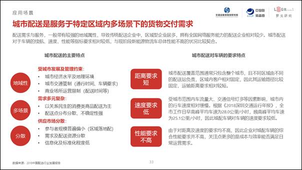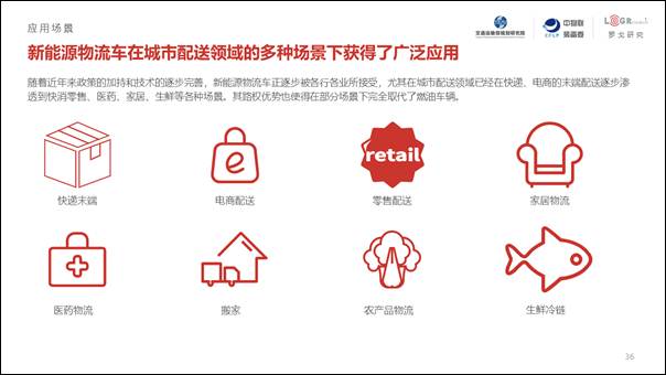 城市配送是當前新能源物流車應用的主要場景,其對距離要求短、速度要求低、性能要求不高的特點,符合新能源物流車當下的發展階段。我們的調研發現,新能源物流車已經在快遞、電商、快消零售、大件家居、醫藥物流、搬家、農產品物流甚至生鮮冷鏈物流等城市貨運的各個細分領域得到了廣泛的應用。