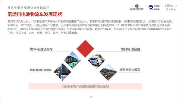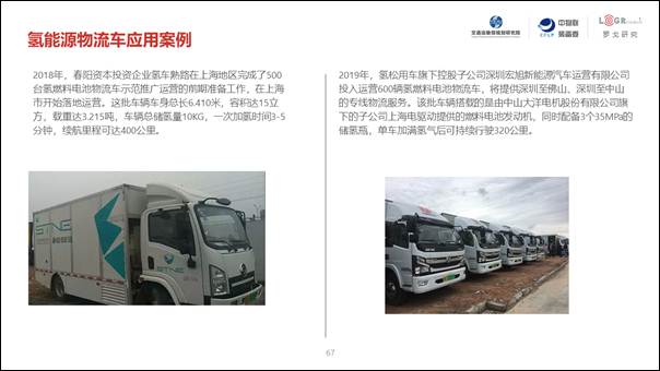 除了純電動物流車,目前國家也在推廣氫燃料電池等其它能源類型的新能源物流車,并已經上海、深圳等一些地區進行了試點應用。氫燃料電池物流車能有效解決當前純電動物流車的續航問題,未來將在干線等中遠距離運輸中發揮重要價值。