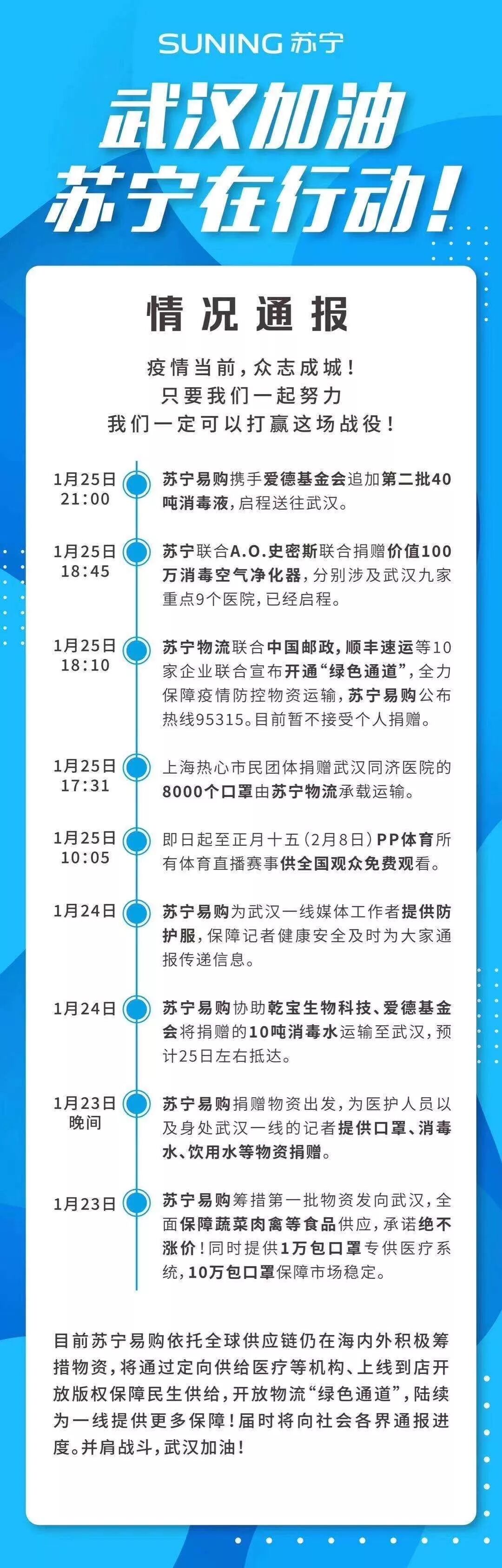 為了全面支持武漢當地抗擊疫情的工作,從1月25日早8時起,京東物流將正式開通全國各地馳援武漢救援物資的特別通道,特此公告如下: