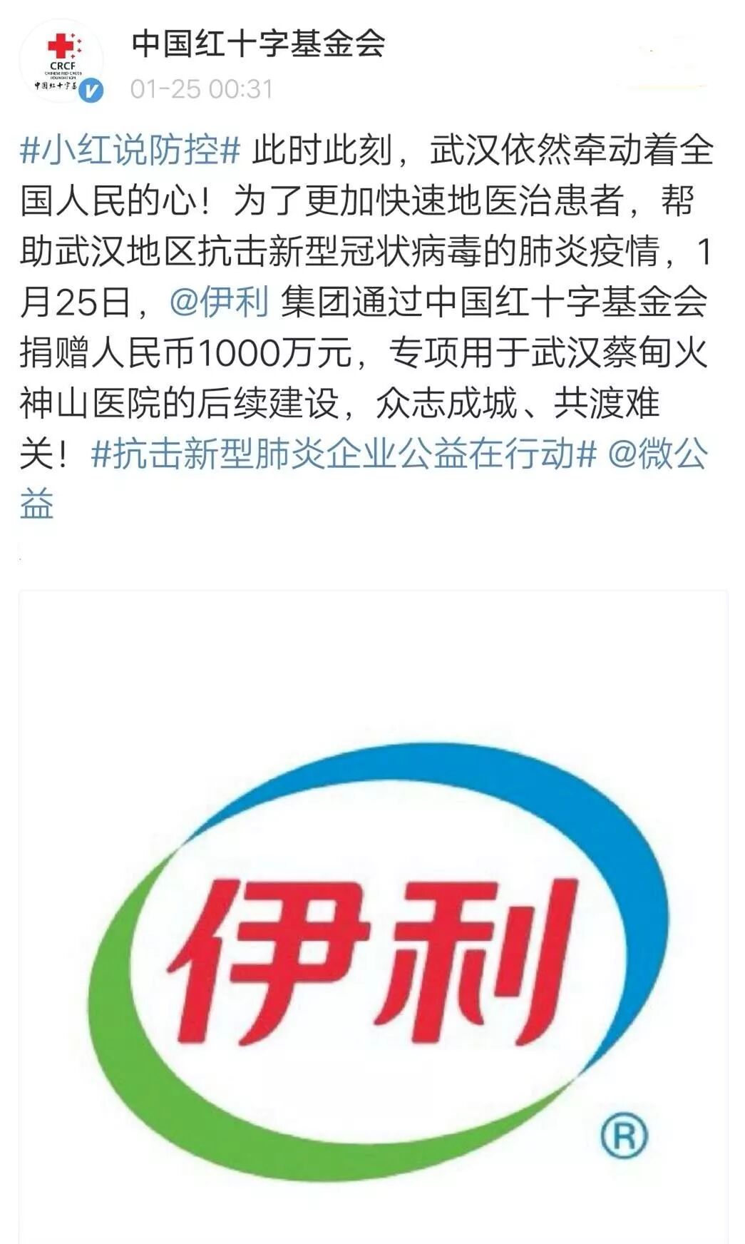 1月25日,伊利集團向中國紅十字基金會第二批捐贈1000萬元,專項用于該醫院的后續建設,一起打贏這場戰“疫”!這是伊利集團繼1月24日第一批捐贈2萬箱牛奶,為奮戰在一線的武漢醫護工作者提供營養保障的捐贈后,支援武漢,抗擊疫情的又一行動。