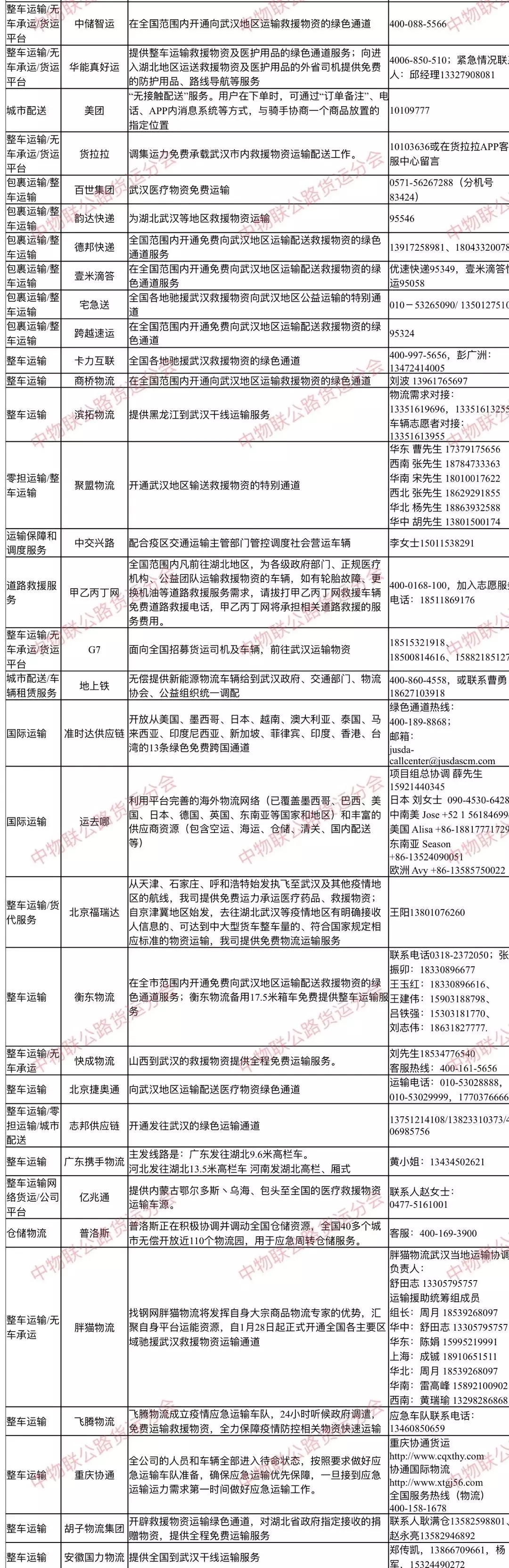 上汽集團旗下“天地華宇”為支援疫情防控,在春節運力緊張之際,開通生命運輸通道,政府和緊急救災物資優先,從即日通過天地華宇客服熱線400-808-6666,請有援助需求的政府和醫療器械生產企業等機構組織及時聯系我們。我們將專門調配人員核實需求并快速有效落實,直至當地物資緊缺問題得到解決。志邦供應鏈自即日起面向全國客戶開通發往武漢的綠色運輸通道,為各企業及個人對武漢援助口罩、護目鏡、防護服等物資提供免費的運輸服務。志邦供應鏈綠色通道熱線:13751214108/13823310373 /400-698-5756唐山胡子物流集團自1月27日緊急啟動救援綠色通道,接到任務后,第一時間派出專管領導接洽并選派優秀黨員、業務骨干安排發運事宜,選派平臺優秀司機和認證車輛具體執行本次任務。于1月28日正式發運首汽批救援物資。