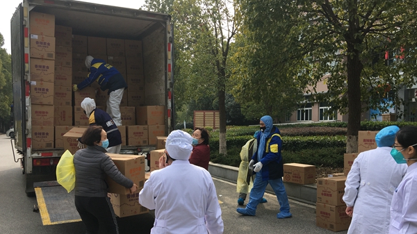 (我司員工抵達金銀潭醫院,正在卸貨)