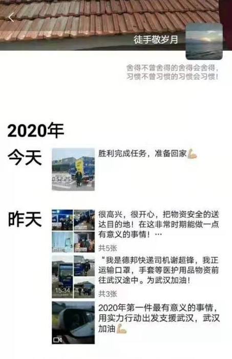 (文化與溝通部訊)自發布“免費為武漢地區運輸救援物資”的通知后,德邦快遞積極協調資源,為武漢市乃至湖北省各個醫院及機構運輸醫療物資等資源。這5天中,每天都有熱血的德邦人報名并參與到這次支援活動。這期間,涌現了不少戰士,并留下了他們的風采。