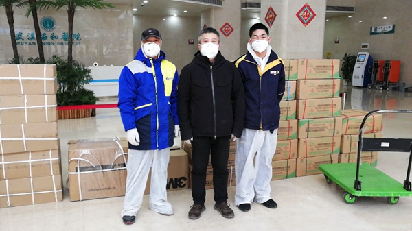 (吳繼鳳(左)與鄭正剛(右)將1100副護目鏡,2400副一次性口罩等物資送達武漢市協和醫院)
