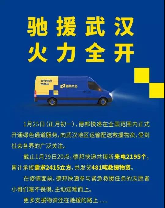 為支援疫情防控,德邦快遞決定從即日起,在全國范圍內開通免費向武漢地區運輸配送救援物資的綠色通道服務,直至當地物資緊缺問題得到解決。