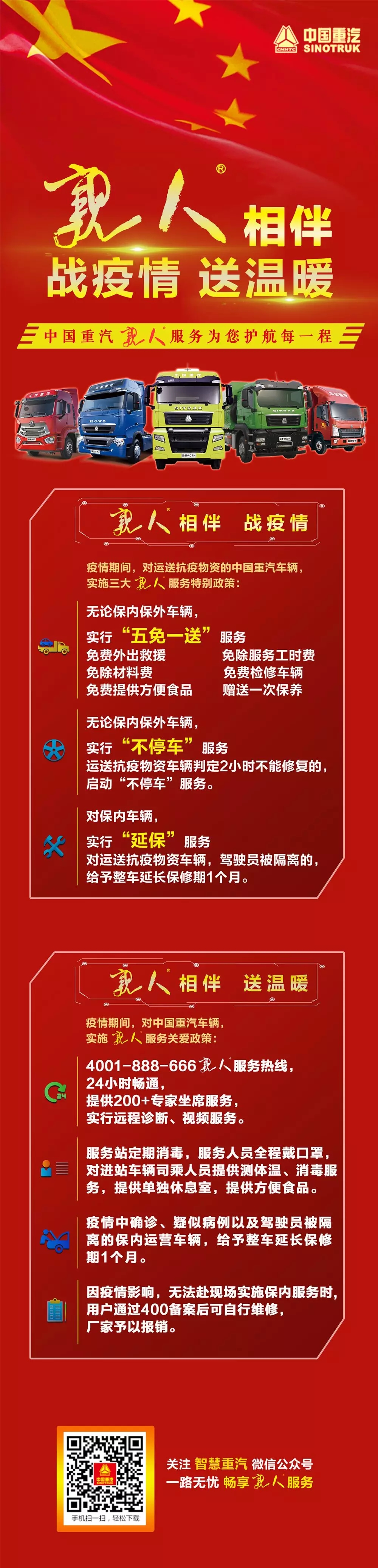為共同抵抗疫情,踐行“客戶滿意是我們的宗旨”核心價值觀,中國重汽對運送抗疫物資的車輛實施三大“親人”服務特別政策、對全國用戶實施“親人”服務關愛政策,讓我們萬眾一心、眾志成城、共同戰(zhàn)“疫”!