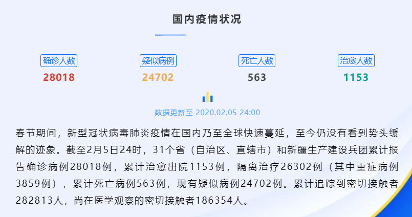 春節(jié)期間,新型冠狀病毒肺炎疫情在國(guó)內(nèi)乃至全球快速蔓延,至今仍沒(méi)有看到勢(shì)頭緩解的跡象。截至2月5日24時(shí),31個(gè)省(自治區(qū)、直轄市)和新疆生產(chǎn)建設(shè)兵團(tuán)累計(jì)報(bào)告確診病例28018例,累計(jì)治愈出院1153例,隔離治療26302例(其中重癥病例3859例),累計(jì)死亡病例563例,現(xiàn)有疑似病例24702例。累計(jì)追蹤到密切接觸者282813人,尚在醫(yī)學(xué)觀察的密切接觸者186354人。