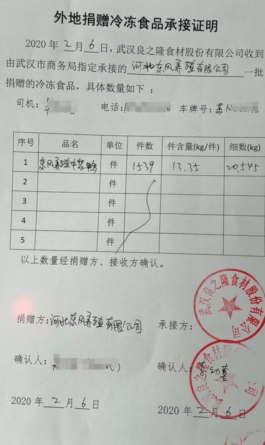 事情還算順利,2月5日在肅縣裝完那20多噸凍品后,他們于2月6日把貨交給武漢良之隆食材股份有限公司,后者是武漢市商務局指定的冷凍食品物資承接單位。雙方驗貨簽字交接后,吳先生他們連夜返回宿遷。