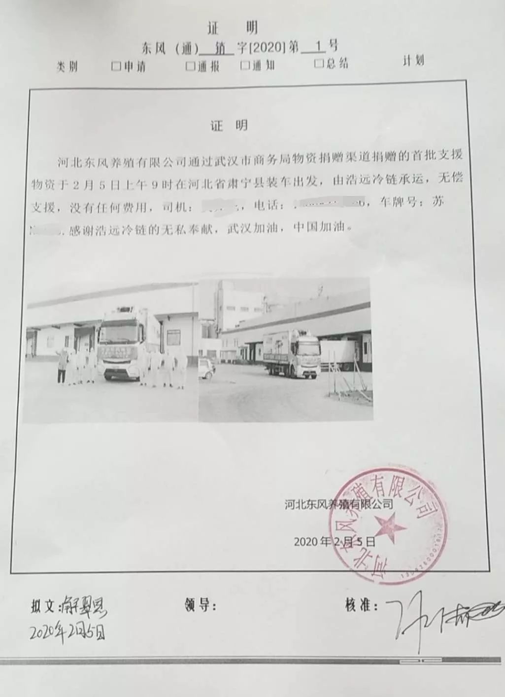 2月4日,宿遷浩遠冷鏈物流的吳先生接到生意伙伴河北東風養殖有限公司的電話,說想給武漢市捐贈20噸凍鴨食品,由于缺乏運力,能否請浩遠冷鏈幫忙進行物資運輸。