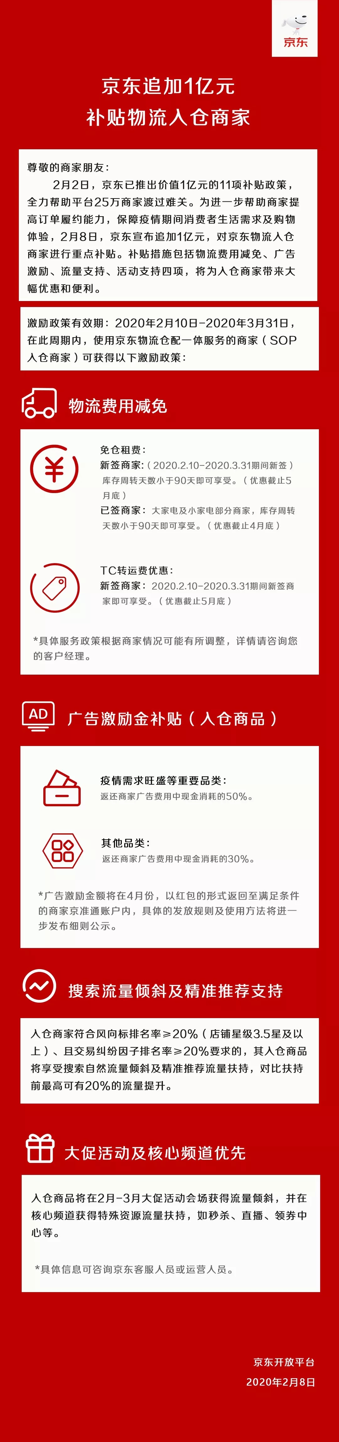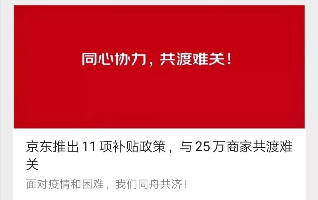 為了幫助廣大商家渡過難關,京東已于2月2日面向平臺25萬商家推出包括費用減免、金融和物流支持、技術支持等在內(nèi)的11項補貼措施,總價值達1億元。
