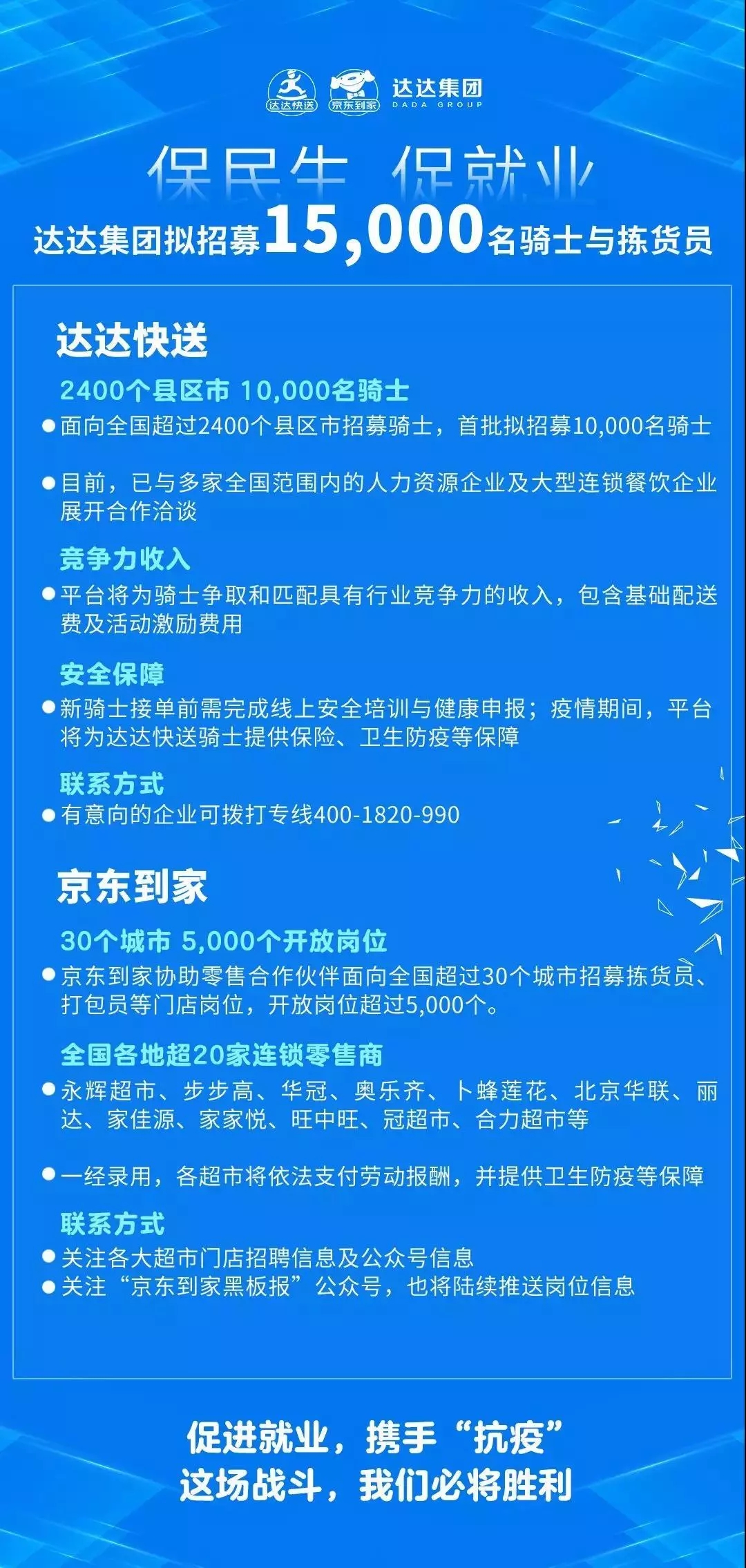 2月7日,為了幫助中小企業(yè)紓困,全力支持穩(wěn)就業(yè)、保民生工作,京東集團及其投資的達達集團(下屬京東到家平臺和達達快送平臺)聯(lián)合宣布將采取靈活多樣的用工形式,面向全社會提供超過35000人的就業(yè)崗位,通過余缺調劑、崗位共享等創(chuàng)新模式,最大程度的減少疫情在短期內(nèi)對就業(yè)產(chǎn)生的沖擊,全力支持湖北及全國取得這場抗疫情、撐經(jīng)濟、保民生戰(zhàn)役的最后勝利。