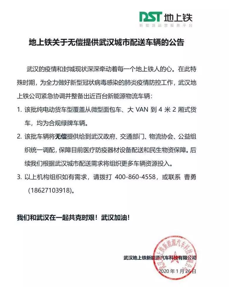 在這樣一個特殊時期,物流運輸擔負著十分艱巨的任務(wù)。地上鐵作為全國最大的新能源物流車運營服務(wù)商,不但要保證物流企業(yè)的車輛需求,更時刻關(guān)注調(diào)度車輛為武漢政府部門、協(xié)會組織、公益機構(gòu)保障救援物資的支持。