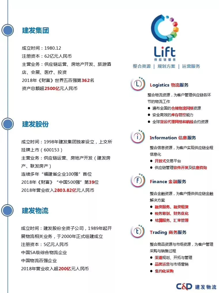 廈門(mén)建發(fā)股份有限公司獨(dú)家設(shè)立的子公司,自1989年開(kāi)展物流相關(guān)業(yè)務(wù),注冊(cè)資金5億人民幣,現(xiàn)已發(fā)展成為年?duì)I業(yè)額超200億、員工數(shù)超500人的中國(guó)5A級(jí)綜合物流企業(yè),同時(shí)也是中國(guó)百?gòu)?qiáng)物流企業(yè)、全國(guó)先進(jìn)物流企業(yè)、福建省示范物流企業(yè)、廈門(mén)市重點(diǎn)物流企業(yè),2018年納稅額超億人民幣。母公司廈門(mén)建發(fā)集團(tuán)創(chuàng)立于1980年12月,三十多年來(lái)形成了以供應(yīng)鏈運(yùn)營(yíng)、房地產(chǎn)開(kāi)發(fā)、旅游酒店、會(huì)展業(yè)、投資等產(chǎn)業(yè)為核心的福建省大型實(shí)業(yè)投資企業(yè)集團(tuán),2019年位列世界五百?gòu)?qiáng)277位、中國(guó)企業(yè)五百?gòu)?qiáng)77名、中國(guó)服務(wù)業(yè)五百?gòu)?qiáng)39名。