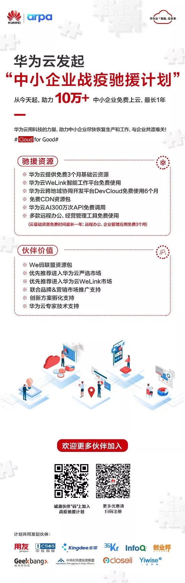 近期,受新冠狀病毒疫情的影響,眾多中小微企業面臨生存壓力。為了幫助中小企業加快復工、復產,最大程度的減少疫情帶來的經濟影響,華為云聯合伙伴共同發起“中小企業戰疫馳援計劃”,推出免費戰疫云資源包,為超過10萬家中小企業提供海量云資源和協同辦公產品,助力他們0成本上云。