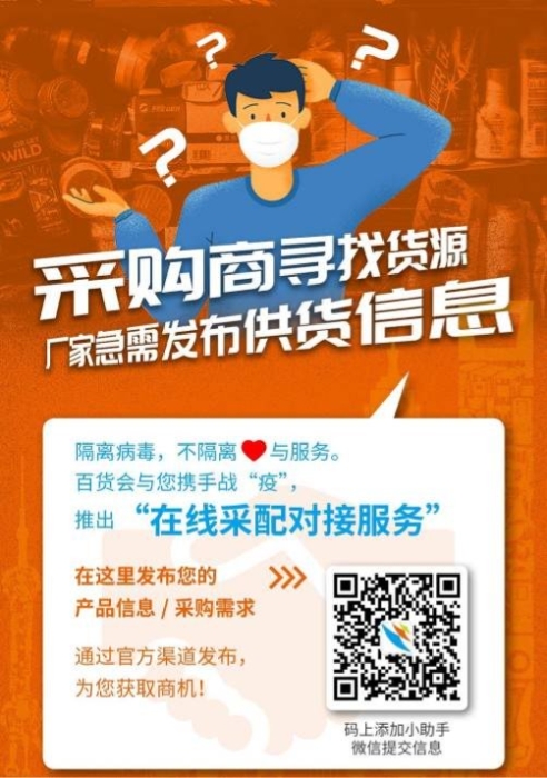 為更好順應(yīng)疫情影響下百貨業(yè)發(fā)展,探索云上破局的全新可能,第114屆百貨會(huì)近期重點(diǎn)推出“在線采配對(duì)接服務(wù)”。屆時(shí),百貨會(huì)官方微信平臺(tái)將免費(fèi)開放,所有參展企業(yè)和采購(gòu)商均可在此發(fā)布供貨信息及采購(gòu)需求。此舉有利于借助百貨會(huì)官方公信力及多年累計(jì)的粉絲影響力,為業(yè)內(nèi)人士爭(zhēng)取高效、直接的對(duì)接服務(wù),打通供需雙方最快捷和最有效的通路。