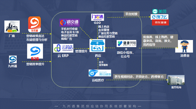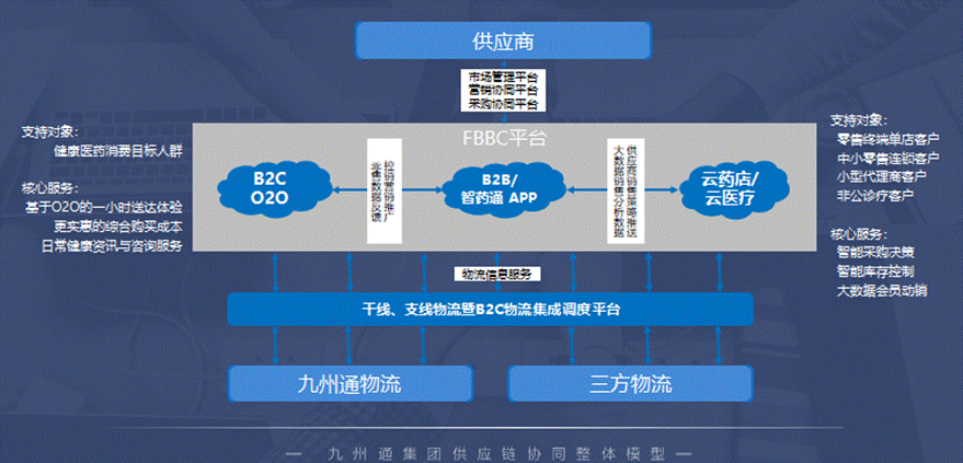 具體而言,九州通集團以B2B和智藥通 APP為核心,從廠家(F端)到九州通(大B端)到零售商(小B)端到消費者(C)的FBBC平臺整個連通。
