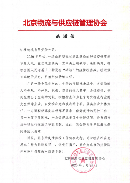 近日,宏遠(yuǎn)集團(tuán)旗下桉楹物流收到北京物流與供應(yīng)鏈管理協(xié)會(huì)的一封感謝信,對(duì)桉楹物流在疫情期間對(duì)首都物流領(lǐng)域抗疫工作做出的貢獻(xiàn)表示感謝。