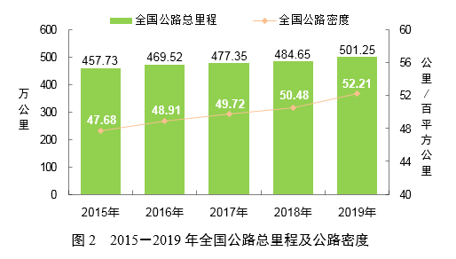 年末全國公路總里程501.25萬公里,比上年增加16.60萬公里。公路密度52.21公里/百平方公里,增加1.73公里/百平方公里。公路養(yǎng)護里程495.31萬公里,占公路總里程98.8%。
