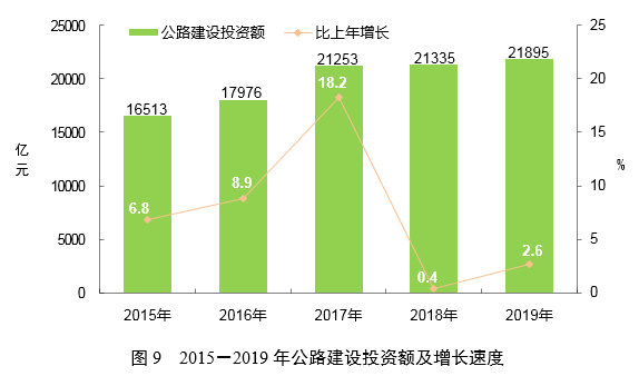 全年完成公路建設投資21895億元,比上年增長2.6%。其中,高速公路建設完成投資11504億元,增長15.4%;普通國省道建設完成投資4924億元,下降10.3%;農(nóng)村公路建設完成投資4663億元,下降6.5%。