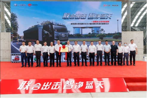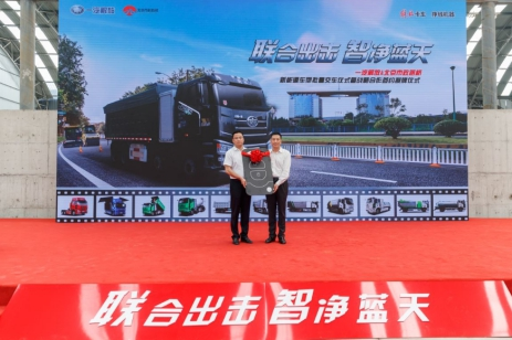 一汽解放集團股份有限公司總經(jīng)理-朱啟昕向北京市政路橋集團黨委副書記、總經(jīng)理-王健中,授予“一汽解放新能源商用車示范運營基地”牌匾,并舉行授牌