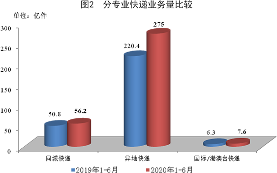 上半年,全國(guó)快遞服務(wù)企業(yè)業(yè)務(wù)量累計(jì)完成338.8億件,同比增長(zhǎng)22.1%;業(yè)務(wù)收入累計(jì)完成3823.8億元,同比增長(zhǎng)12.6%。其中,同城業(yè)務(wù)量累計(jì)完成56.2億件,同比增長(zhǎng)10.6%;異地業(yè)務(wù)量累計(jì)完成275億件,同比增長(zhǎng)24.7%;國(guó)際/港澳臺(tái)業(yè)務(wù)量累計(jì)完成7.6億件,同比增長(zhǎng)20.9%。