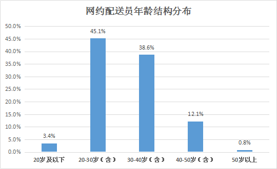 2019年,通過美團平臺獲得收入的網約配送員總數達到398.7萬人。在所有網約配送員中,20-40歲網約配送員的占比超過83.7%(如下圖)。從新冠疫情期間新增網約配送員的數據看,20-30歲為疫情期間新增網約配送員的主要年齡段,占比為45.3%,其次為30-40歲網約配送員,占比為39.0%,與2019年20-40歲年齡段網約配送員的占比(約83.7%)持平。