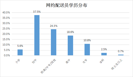 根據美團《2018年外賣騎手就業報告》,網約配送員的學歷以初中、高中學歷為主,值得注意的是,擁有大學文憑(大專、本科、碩士及以上)的網約配送員比例近15%。