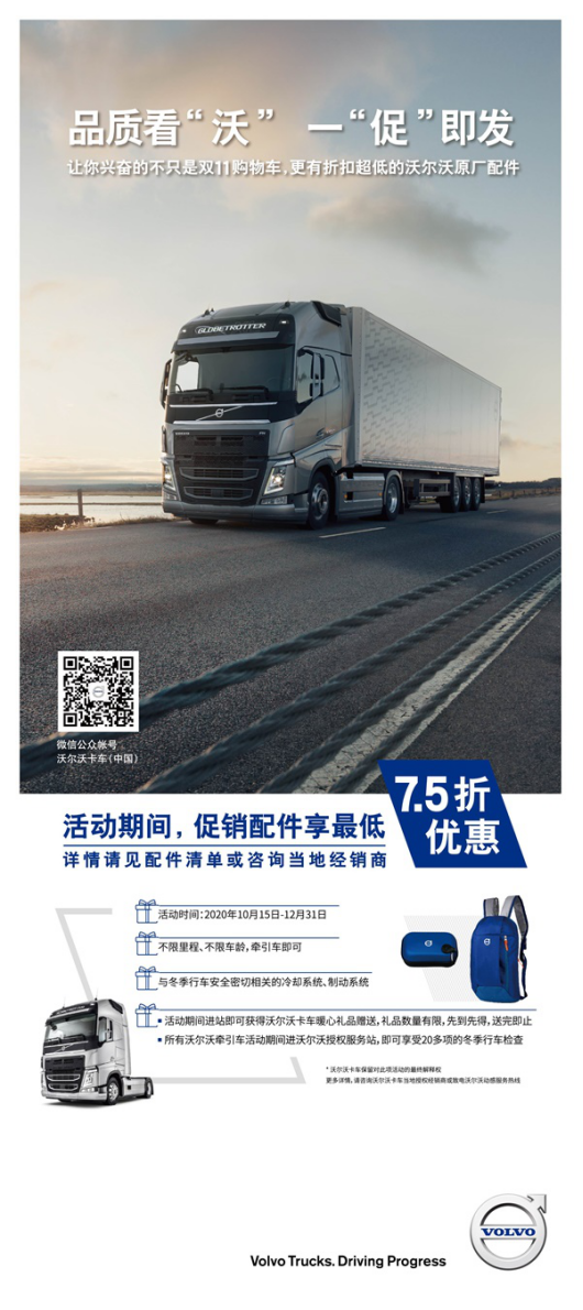 與此同時,沃爾沃卡車在雙十一期間推出了原廠配件促銷活動,誠意回饋廣大客戶的支持。針對與冬季行車安全密切相關的冷卻系統、制動系統的零部件,沃爾沃卡車推出限時折扣,提醒各大物流企業在強調車輛運輸效率之外,也應當及時更換老化磨損的配件,保障行車安全。