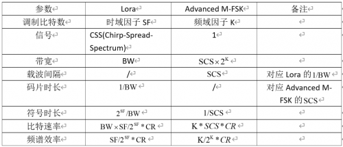 以LoRa為例,Advanced M-FSK和其幾個參數的對比情況如下: