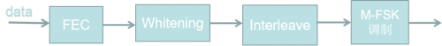 數據幀即傳輸MAC層傳給物理層的有效信息,Advanced M-FSK可支持各種速率的數據發送。整個發射過程如下,即數據編碼,白化,交織,最后是映射發送。這個過程的幾個關鍵信息:編碼速率,重復次數,發送頻點數,決定了數據和相應接收機靈敏度。這些關鍵信息通過SYNC幀發送。