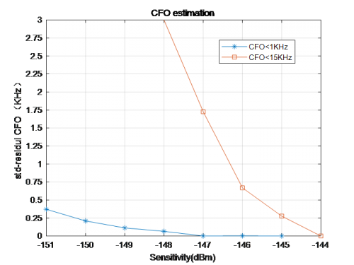 接收機的三項關鍵技術:時頻同步,數據解調,終端移動速度支持。比如,極低信噪下時頻同步性能:比較終端頻偏較大和頻偏較小兩種場景。在頻偏較小場景時,假設頻偏殘留誤差在200Hz內為標準,靈敏度可以到-150dBm。如果一些低成本的終端,即存在較大頻偏時,靈敏度也可以到-145dBm。