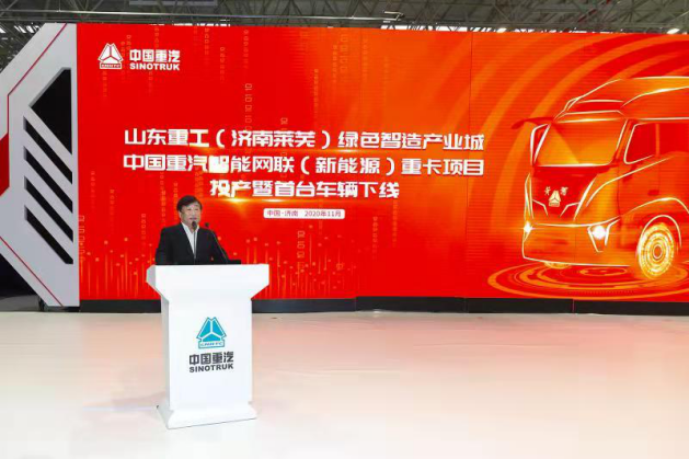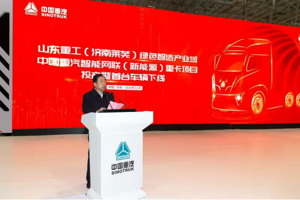 2020年11月19日上午9時,山東重工(濟南萊蕪)綠色智造產業城—中國重汽智能網聯(新能源)重卡項目投產暨首臺車輛下線儀式在該項目總裝車間隆重舉行。隨著屏幕緩緩開啟,一輛剛剛組裝下線的新一代黃河重卡緩緩駛到舞臺中央,標志著中國重汽智能網聯(新能源)重卡項目正式投產。